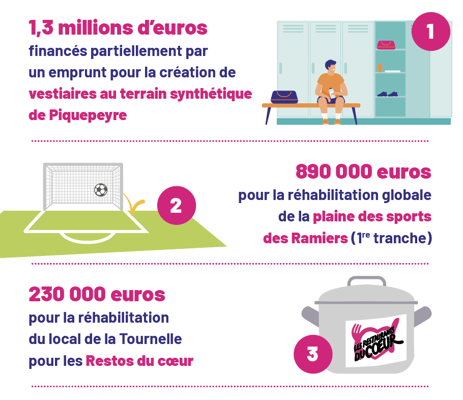 • Réhabilitation des espaces endommagés (boulodrome, tir sportif, club canin, promenade René Delsol, etc.) : 110 000 euros