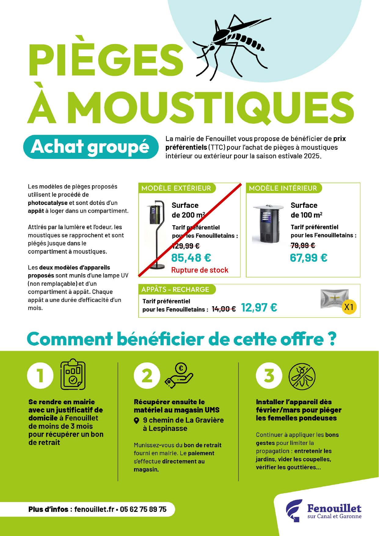 La mairie de Fenouillet propose aux habitants de la commune de bénéficier de tarifs préférentiels pour l’achat de pièges à moustiques intérieur ou extérieur pour la saison estivale 2025 en partenariat avec l’entreprise UMS située à Lespinasse.
