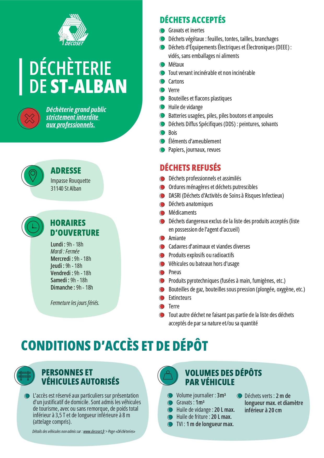 La déchèterie de Saint-Alban est gérée par le syndicat mixte Decoset. L’accès est gratuit est réservé aux particuliers sur présentation obligatoire du Pass déchèterie (voir ci-dessous). Sont admis les véhicules de tourisme, avec ou sans remorque, de poids total inférieur à 3,5 T, de 1,90 m de hauteur et de longueur inférieure à 8 m (attelage compris).
