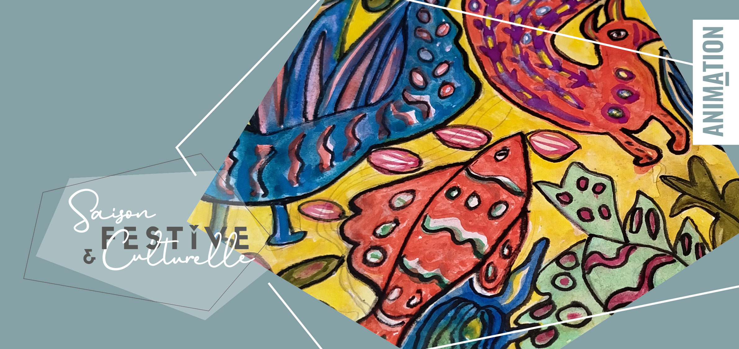Atelier de peinture autour de l’œuvre de l’artiste algérienne Baya avec La grande Roue. En s’inspirant de son univers foisonnant de couleurs et de créatures imaginaires, vous réaliserez des motifs peints, de façon assez libre et spontanée, sur un carreau de papier.
