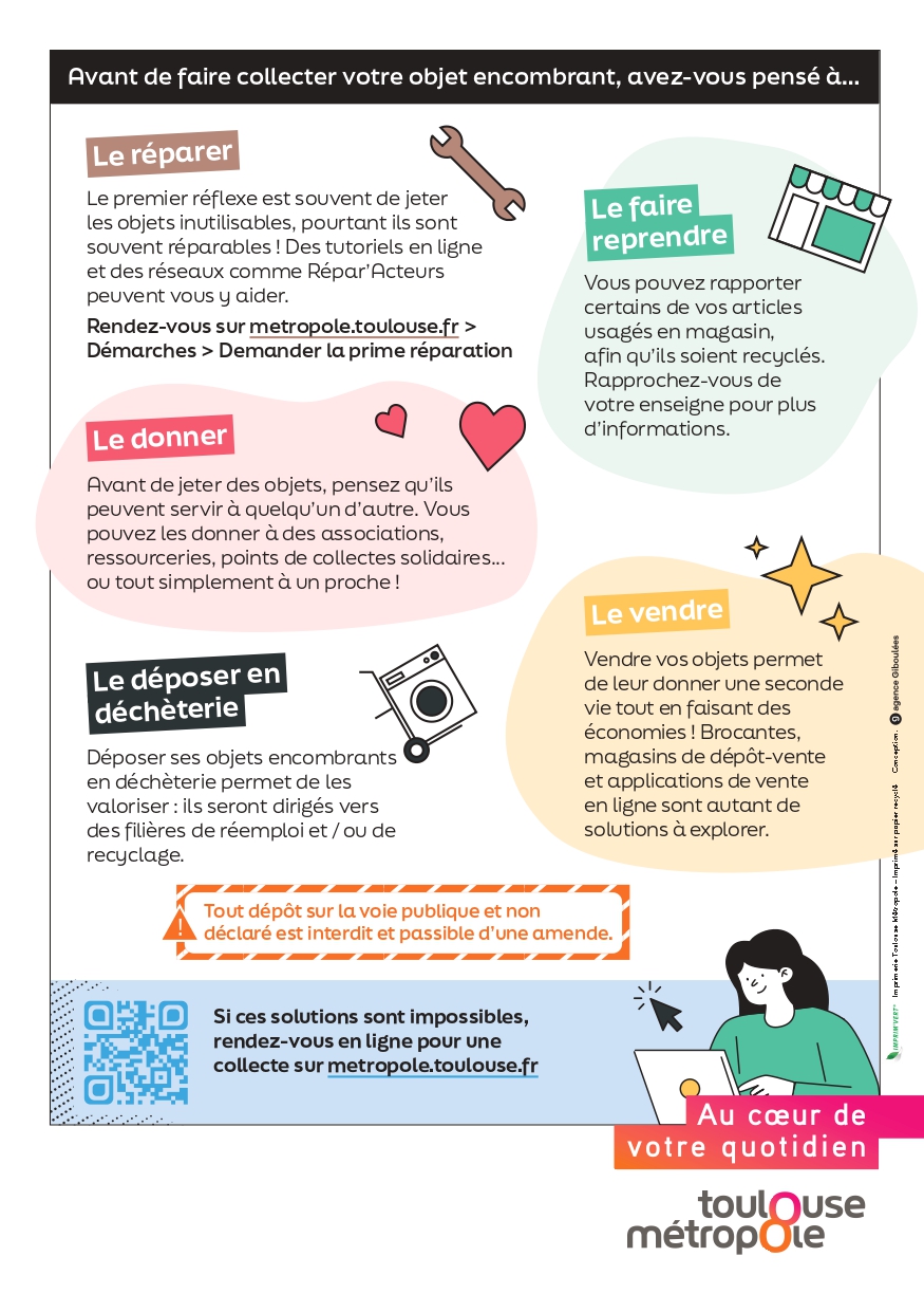 Le dépôt d’un objet aux encombrants devrait donc être la dernière solution pour une gestion collective et raisonnée des déchets : d’autres solutions existent !