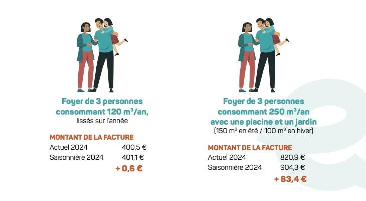 La tarification saisonnière de l’eau ne pénalisera pas les ménages ayant une consommation stable sur l’année, les mois majorés étant compensés par sept mois de baisse du prix de l’eau (3,34 euros TTC/m3 en 2024).