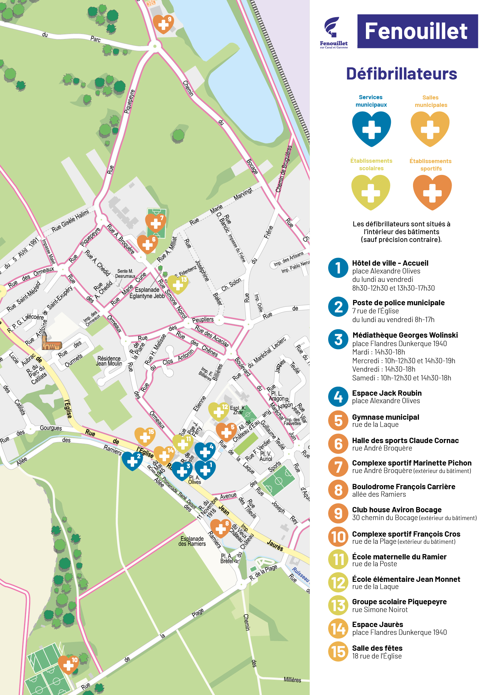 Consultez la carte ci-contre pour connaître l’emplacement des défibrillateurs.