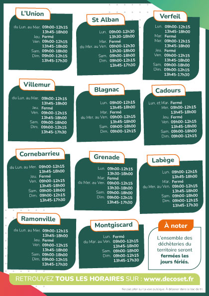Cliquez ici pour télécharger le PDF avec les nouveaux horaires de toutes les déchèteries Decoset.
