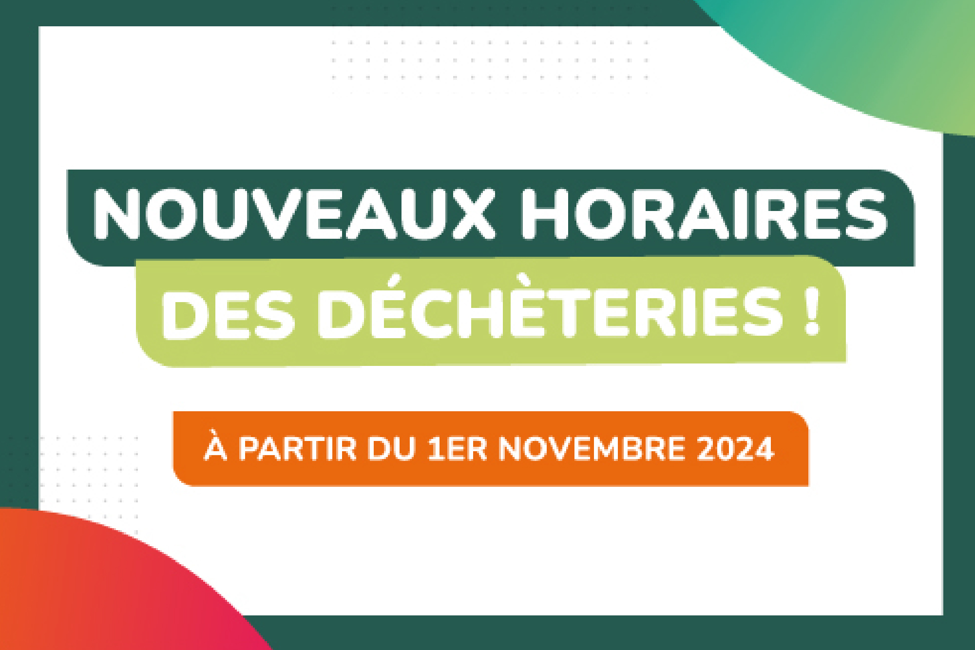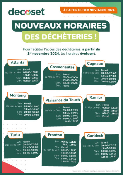 À partir du 1er novembre 2024, de nouveaux horaires et jours de fermeture sont mis en place sur l’ensemble des déchèteries du territoire de Decoset.