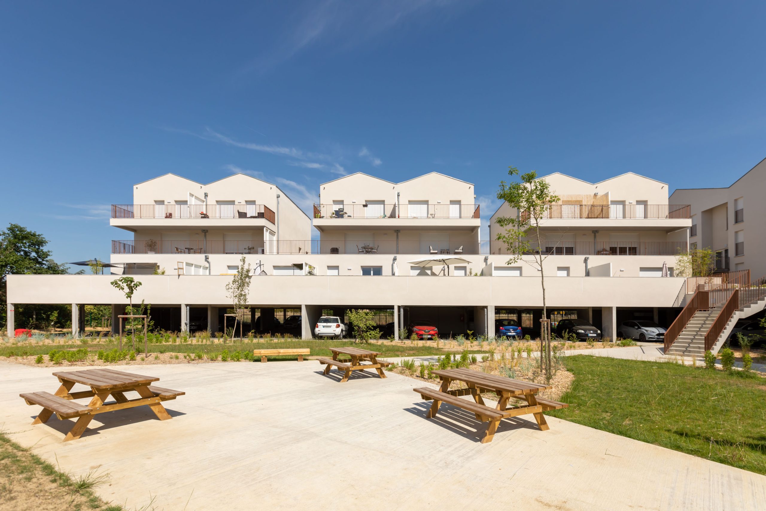 Ces habitations lumineuses offrent de belles ouvertures, dont les séjours tous ouverts sur un jardin privatif, en prolongement d’une terrasse en bois ombragée d’une pergola ajourée.