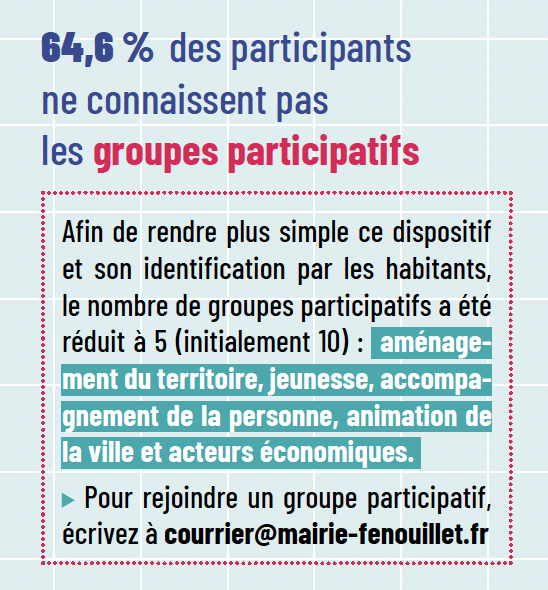 De juillet à novembre 2023, les habitants de Fenouillet ont été invités à exprimer leurs avis et leurs attentes sur plusieurs sujets concernant les services de proximité. Merci à l’ensemble des participants pour les 602 contributions qui permettront d’ajuster les politiques publiques mises en oeuvre à Fenouillet.