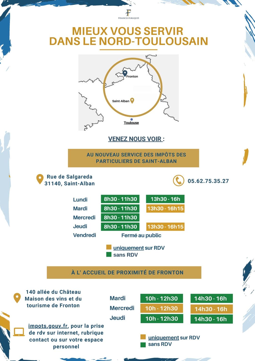 Dans le cadre de la modernisation du réseau de proximité de la Direction Générale des Finances Publiques, un nouveau service des impôts des particuliers (SIP) est ouvert à Saint-Alban depuis le 1er janvier 2022 dans les locaux de l’actuelle Trésorerie et est compétent sur le nord du département.